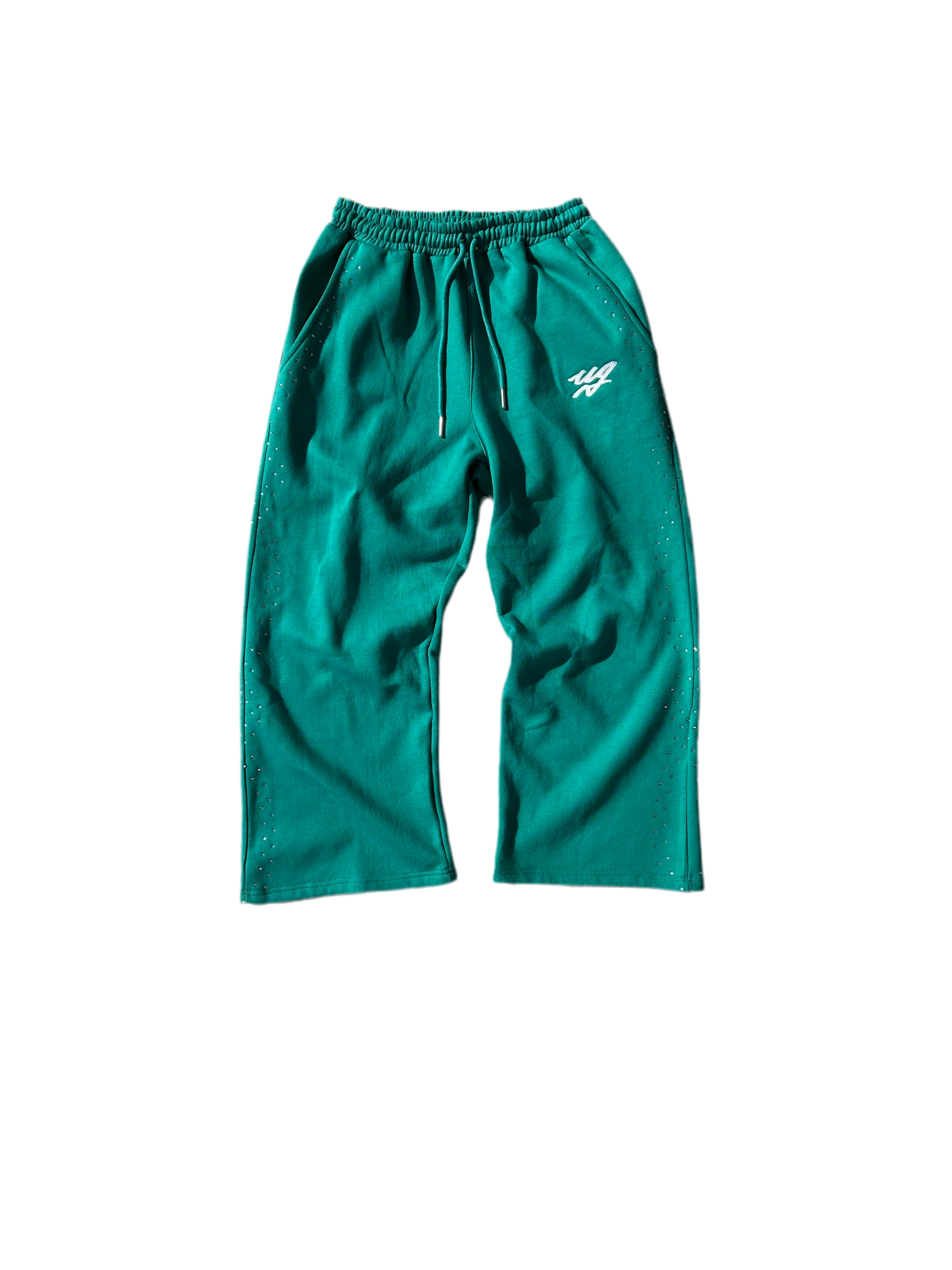 The BLUEEN RHINESTONE PANT combines style and comfort effortlessly. Named after its unique blue-and-green blended fabric, the BLUEEN Pant features delicate UG embroidery and elegant rhinestone details running along the sides, adding just the right amount of sparkle. Its wide-bottom design ensures a flattering fit and freedom of movement, making it perfect for both casual outings and special occasions. Crafted for all-day comfort, these pants elevate your look while keeping you cozy. Stand out with a unique piece that blends chic fashion with unbeatable comfort.